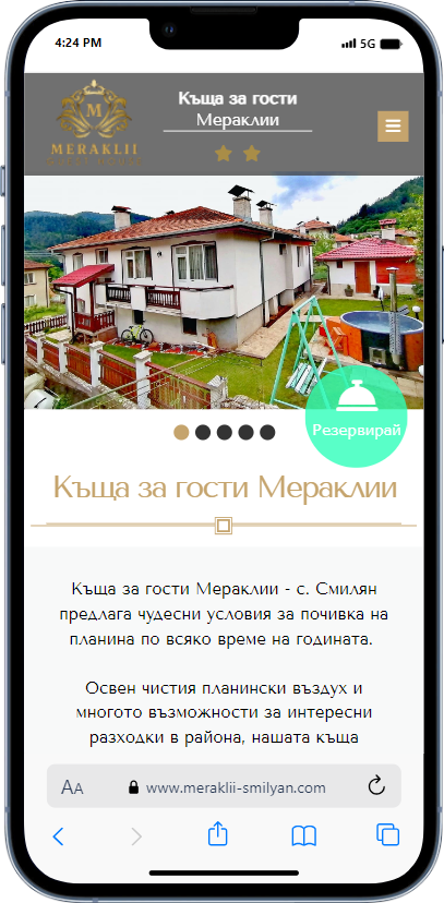 The guest house is located in the village of Smilyan, Smolyan region. The business has well-maintained social networks that present some of the offered services, but they do not have their own web page that provides complete information about the business. The house has several separate parts that have been taken into account, such as bedrooms, tavern, barbecue, relaxation area and children's corner. The web application provides complete information about the services offered, in a fast and functional way, giving a complete picture of the house.